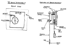 Open the rear door and look for the count-wheel A in the diagram. Lift and release the detent – part B with a matchstick or suitable tool. The clock will start to strike and the count-wheel will slowly turn. By lifting and releasing the detent the clock can be made to strike the correct number blows as shown on the dial. The clock can now be set to the correct time by turning the minute hand clockwise stopping at each hour until striking stops.