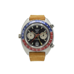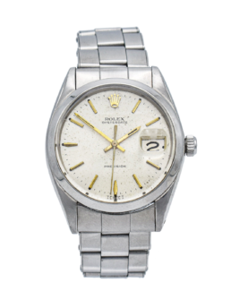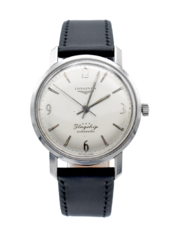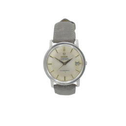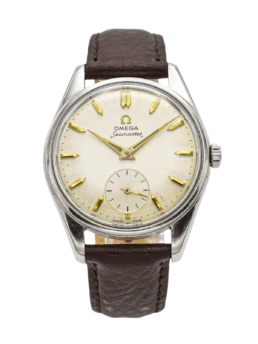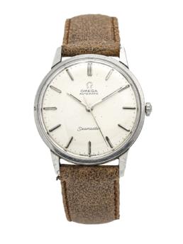 An attractive and well preserved 1958 Omega (ref 2852.11SC) measuring 36mm across without the winding crown. A polished stainless steel case in good original condition with crisp edges, the ‘Pie-pan’ dial has the rarer ‘Waffled’ center, arrowhead indices and gold delphine hands with raised Omega logo. Automatic, Chronometer, Officially Cert’. The watch is in very good order throughout. The crown with logo is the Omega original and it’s an automatic wind Cal-505 with 24 jewels and tested to five positions, The 505 is a beautiful movement and deserves the title of ‘Chronometer’. Sold with a ‘Presentation box’ too.