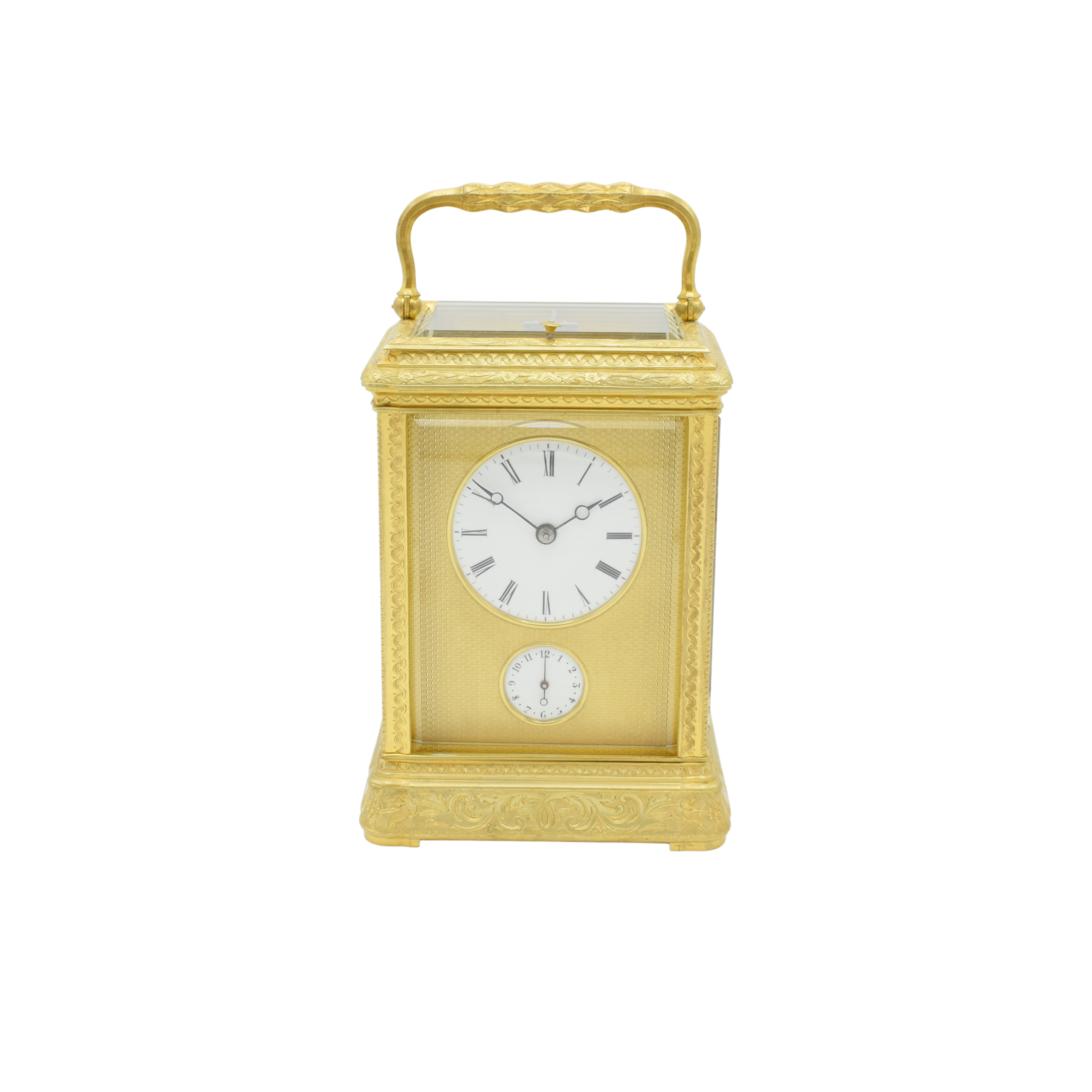 This fine engraved ‘gorge’ cased carriage clock was made in Paris circa 1860-80. The clock is in very original condition, the engraving is remarkably crisp and sharp with some of the original gilt in places and with a gilt ‘engine turned’ masked dial. Bevelled glass to all sides and a top glass to view the original Bi-metallic, jeweled silvered lever escapement . Push repeat and bell striking on the hour with alarm facility. The movement is completely original and serviced, cleaned and polished and sold with a full 24 month guarantee . The dial showing Roman numerals with the blued steel Breguet hands. This is one of the slightly larger sizes of ‘gorge’ case and is very pleasing ‘in hand’. Stamped with a B in a circle and numbered 2690.