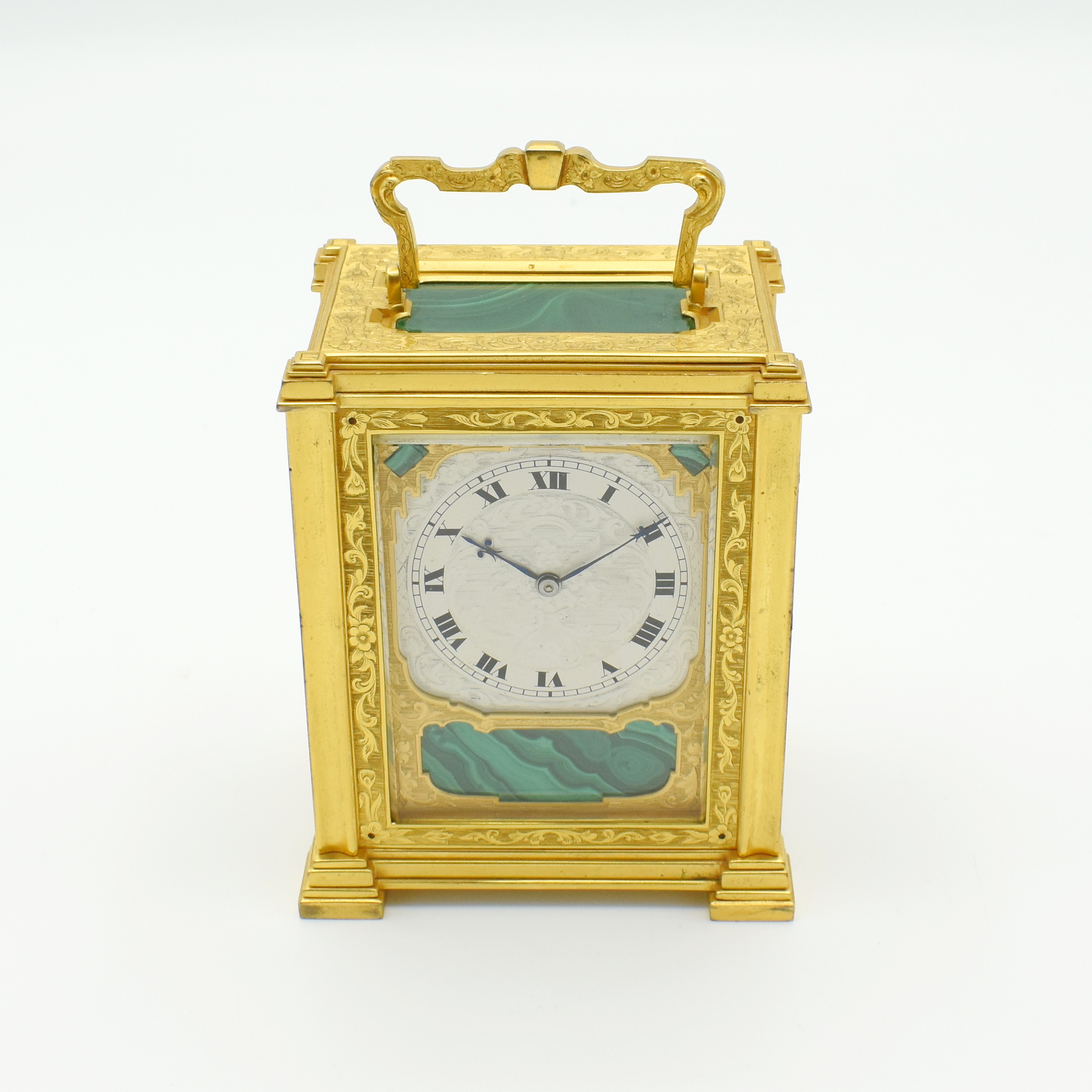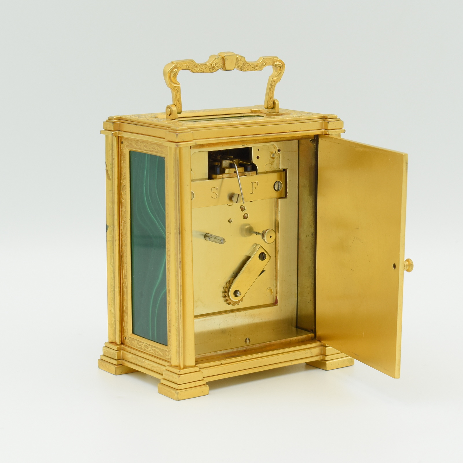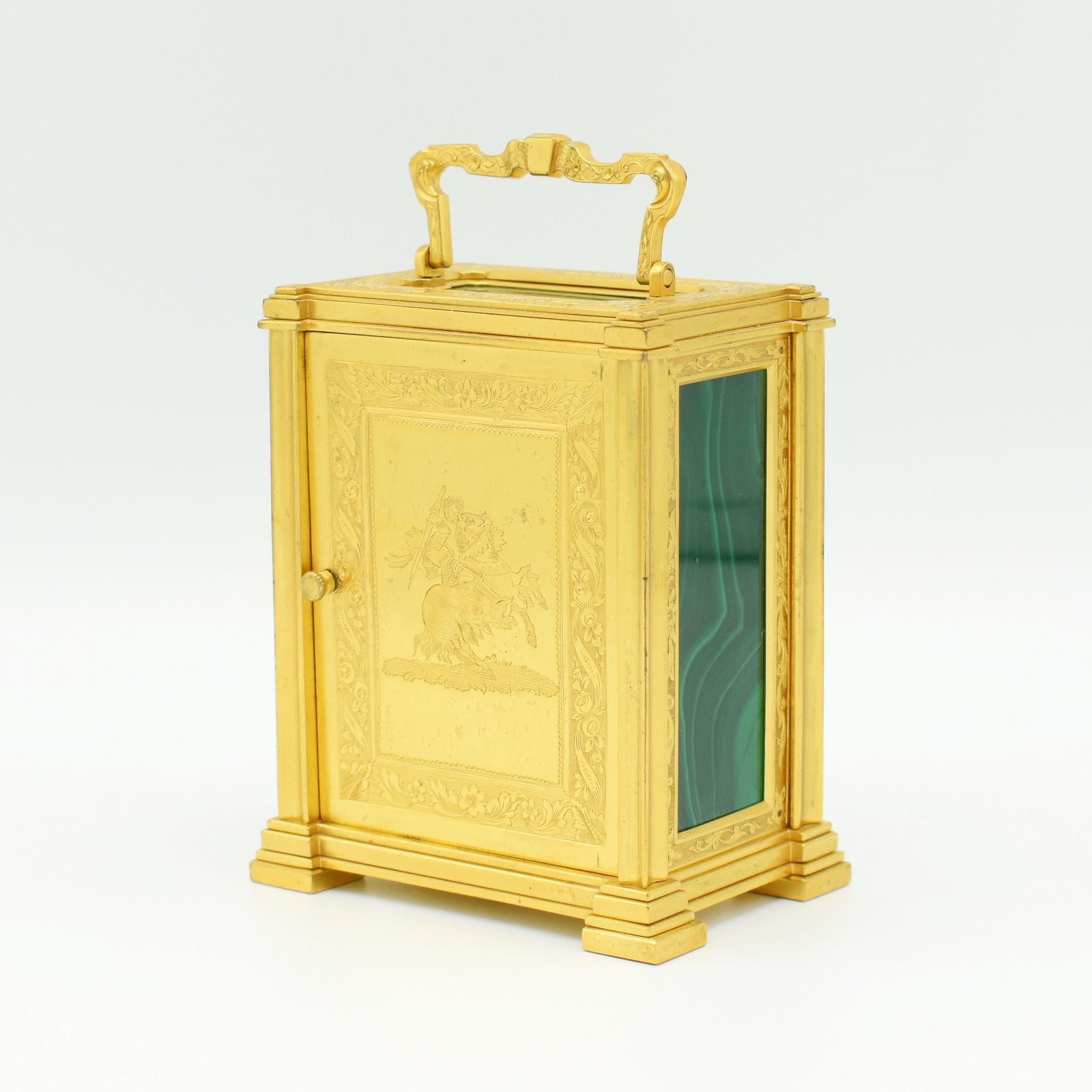 A very attractive single fusee carriage timepiece in an engraved, original gilt bronze case, the top, front, and sides inset with malachite gemstone panels with particularly nice banded patterns on display, framed by gilded plates with foliate engraving. The case is surmounted by a decorative chased carrying handle, and to the rear a jousting knight on horseback engraved into the back door. The beautifully engraved and silvered dial is framed by a gilt engraved ‘mask’ with Roman numerals, foliate centre, and blued steel hands. The single chain fusee movement and maintaining power will run for a week on a single wind. It’s very likely from the workshops of the fashionable, Somerset born clockmaker Thomas Cole. The rear of the dial is signed Cottebrune of Dean Street, Soho. In the book about Thomas Cole we have found similar examples to this one but without the Malachite panels. The engraving and multilayered construction is almost identical to another Cole clock we have in stock. The addition of the Malachite on this clock really does make it quite unique. Charles Cottebrune of 29 Dean St was most likely of French origin and worked alongside other great clockmakers of the period.