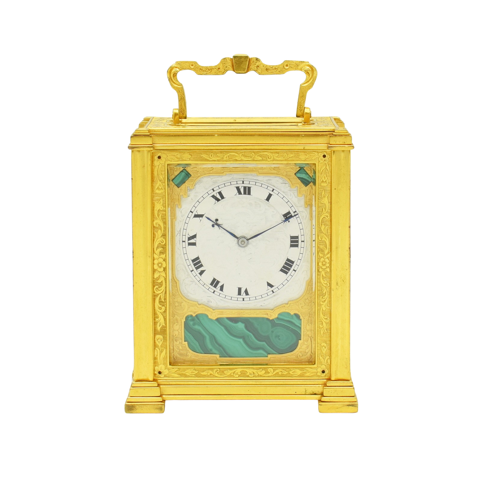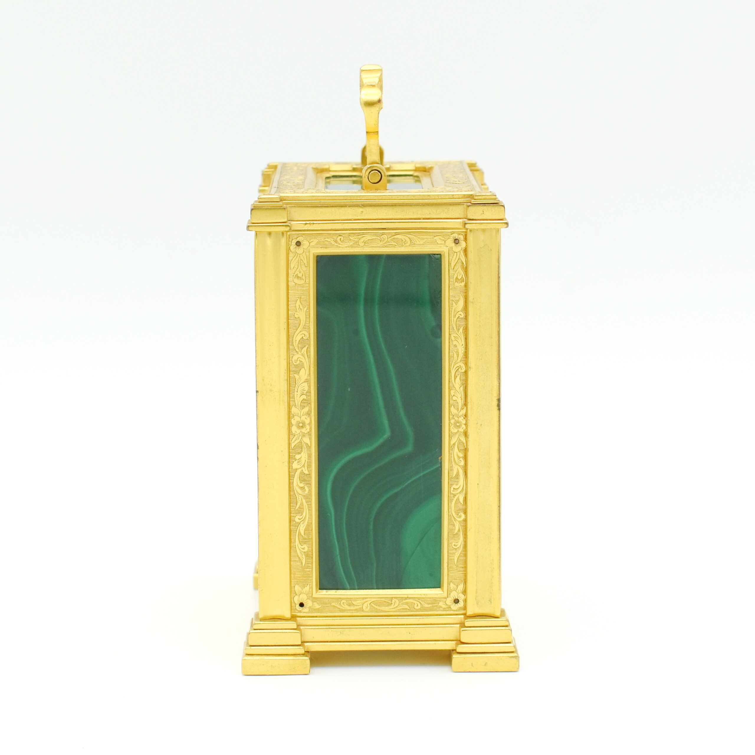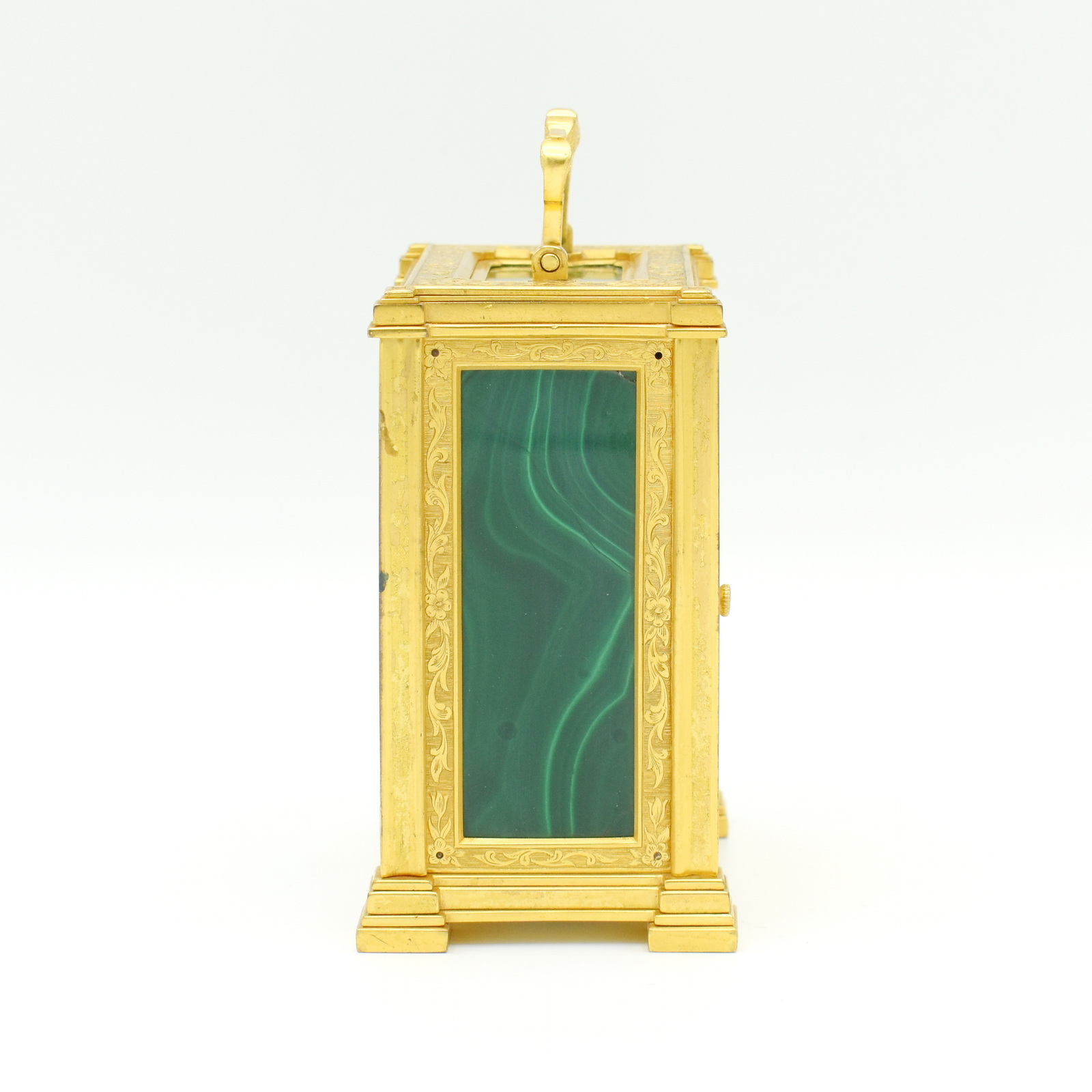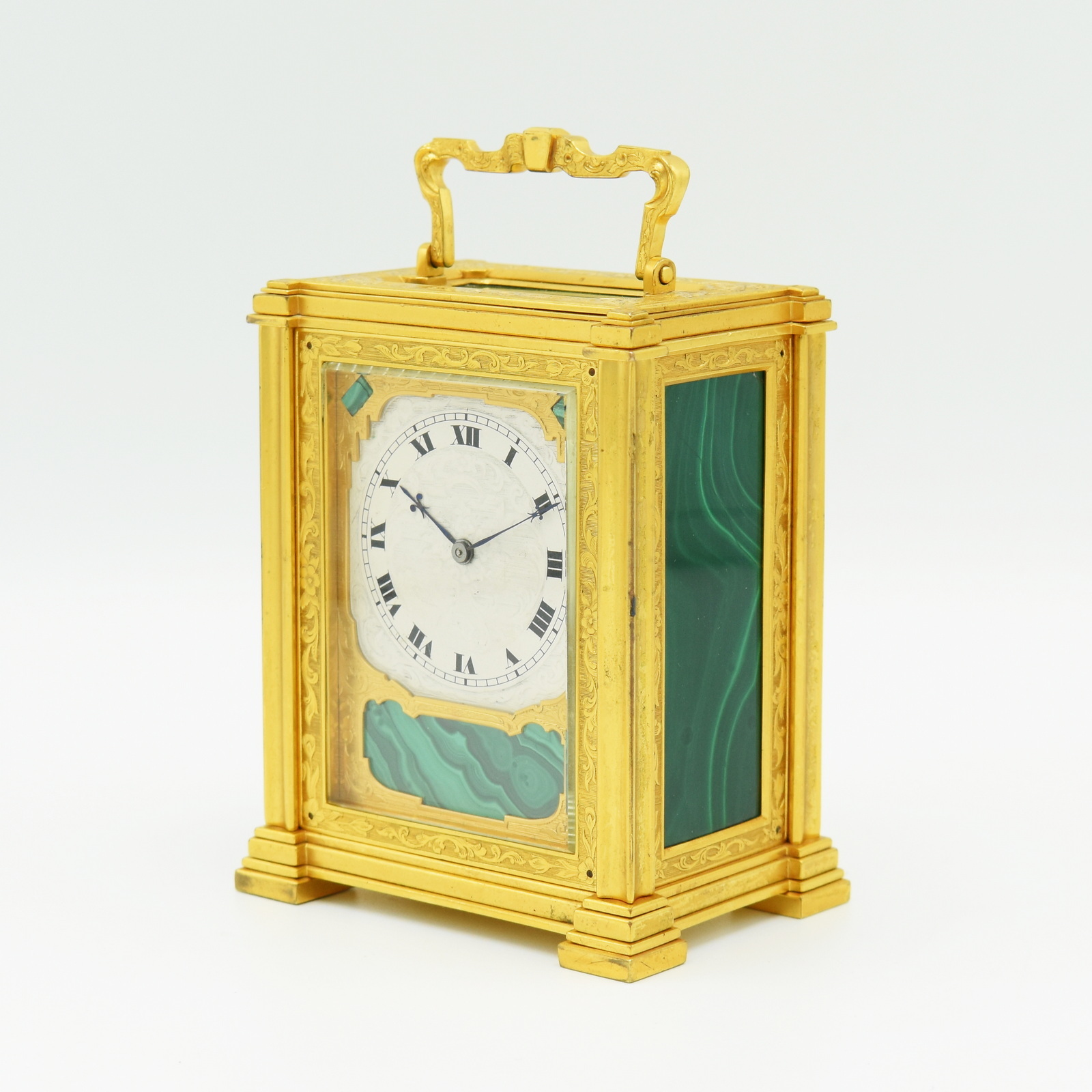 A very attractive single fusee carriage timepiece in an engraved, original gilt bronze case, the top, front, and sides inset with malachite gemstone panels with particularly nice banded patterns on display, framed by gilded plates with foliate engraving. The case is surmounted by a decorative chased carrying handle, and to the rear a jousting knight on horseback engraved into the back door. The beautifully engraved and silvered dial is framed by a gilt engraved ‘mask’ with Roman numerals, foliate centre, and blued steel hands. The single chain fusee movement and maintaining power will run for a week on a single wind. It’s very likely from the workshops of the fashionable, Somerset born clockmaker Thomas Cole. The rear of the dial is signed Cottebrune of Dean Street, Soho. In the book about Thomas Cole we have found similar examples to this one but without the Malachite panels. The engraving and multilayered construction is almost identical to another Cole clock we have in stock. The addition of the Malachite on this clock really does make it quite unique. Charles Cottebrune of 29 Dean St was most likely of French origin and worked alongside other great clockmakers of the period.