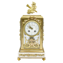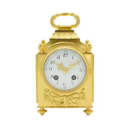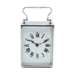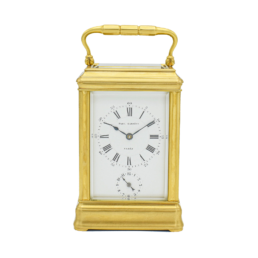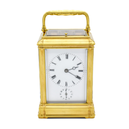 A fine ‘Grande Sonnerie’ carriage clock in a gilt gorge case with a White enamel dial and bevelled Silvered sight ring. This clock has been fully restored, which involved a complete disassembly, 3 stage clean and polish, assembly, test and regulation. The clock is stamped 22495 which could be attributed to Henri Jacot. This fine clock also retains the original large Silvered platform and jeweled lever escapement. Grande sonnerie striking, petite sonnerie and fully silent if you wish. The push repeat button to repeat the last hour and quarter. Thick bevelled White glass panels to all sides. A chime selection lever to the base. Circa 1900.