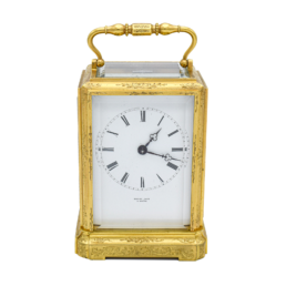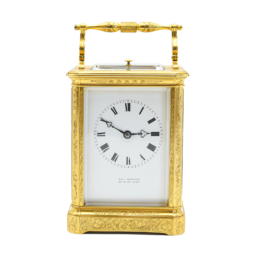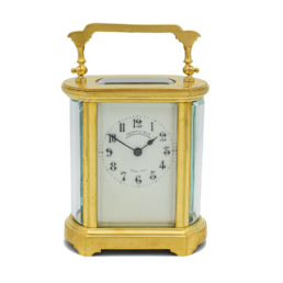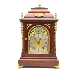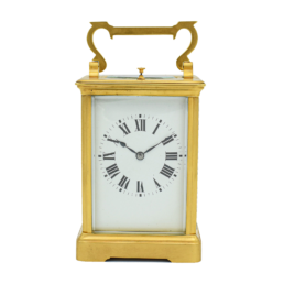 A French mantel clock on a Marble base which has Ormolu decorations, the clock is of 8 day duration, striking hourly and half hourly on a bell with a white convex enamel dial showing Arabic Numerals and garlands of flowers with finely pierced Gilded Brass Hands and a cast brass bezel surround. A small clock which would fit most mantels or perhaps even a ‘Boudoir’! Made in Paris around 1890.