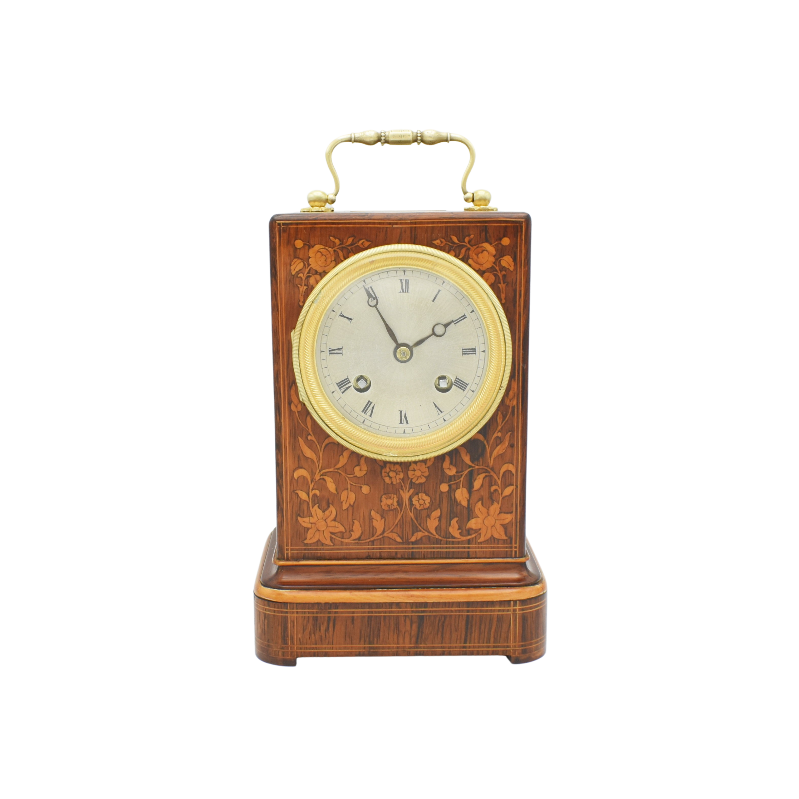 A fine and slim Rosewood mantel clock with boxwood line inlays and marquetry decoration . The round ‘engine turned’ silvered dial showing Roman numerals and blued hands in the Breguet style. This clock has a bell strike on the hour and one for the half hour. This clock has ‘countwheel’ strike which means that you can choose to run the clock silently if you wish. This early ‘pendule portative’ as they are known in France is a truly portable clock as it has a silk suspension, this means you do not have to worry about removing the pendulum if placing the clock in a different room. Circa 1830-50. The movement is stamped Laine a Paris and has the number 430. There are clocks by Laine in museums and collections. On the inner edge of the glass there are two very small chips which are only noticeable if looking closely, the glass is the original so we have chosen to leave it but if the purchaser would like a new glass, we can arrange that, of course.