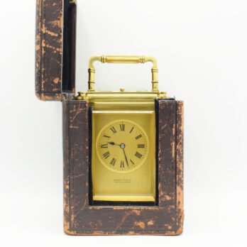 An extremely fine and rare Carriage clock in the ‘Bamboo’ style with Morrocan leather outer protective case made by Leroy et Fils. The gilded clock case is in good condition showing only minor rubbing. Particularly attractive with a good size ‘sight’ to the front bevelled glass and stylish carrying handle. The movement is of excellent quality striking the hours and halves on a coiled gong. With a gilt dial showing Roman numerals as well as delicate blued steel hands. The dial bears the maker’s name and address where this clock was sold circa 1890-1900. It’s worth pointing out the outer case still retains a part of the original label (see photos). The father – Basile Charles Leroy -1765-1839 established the company which survived the French Revolution and went on to become the clockmaker to Napolean I.`