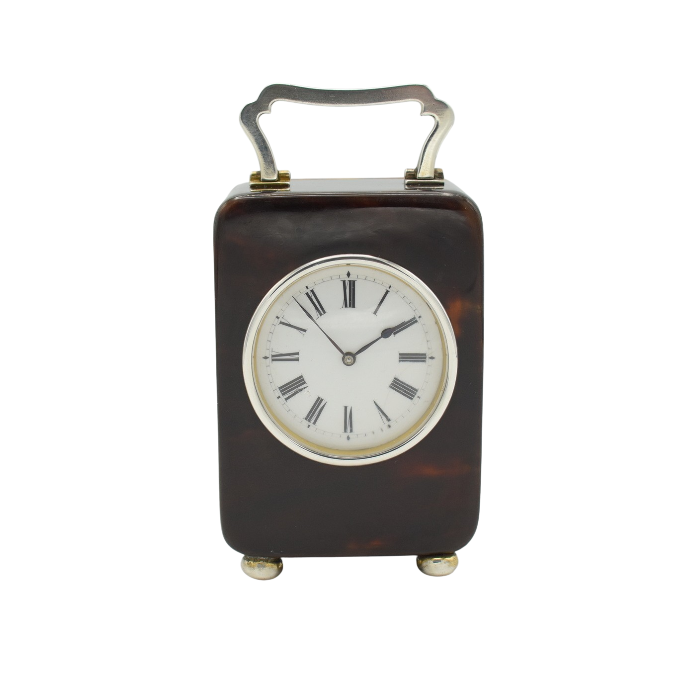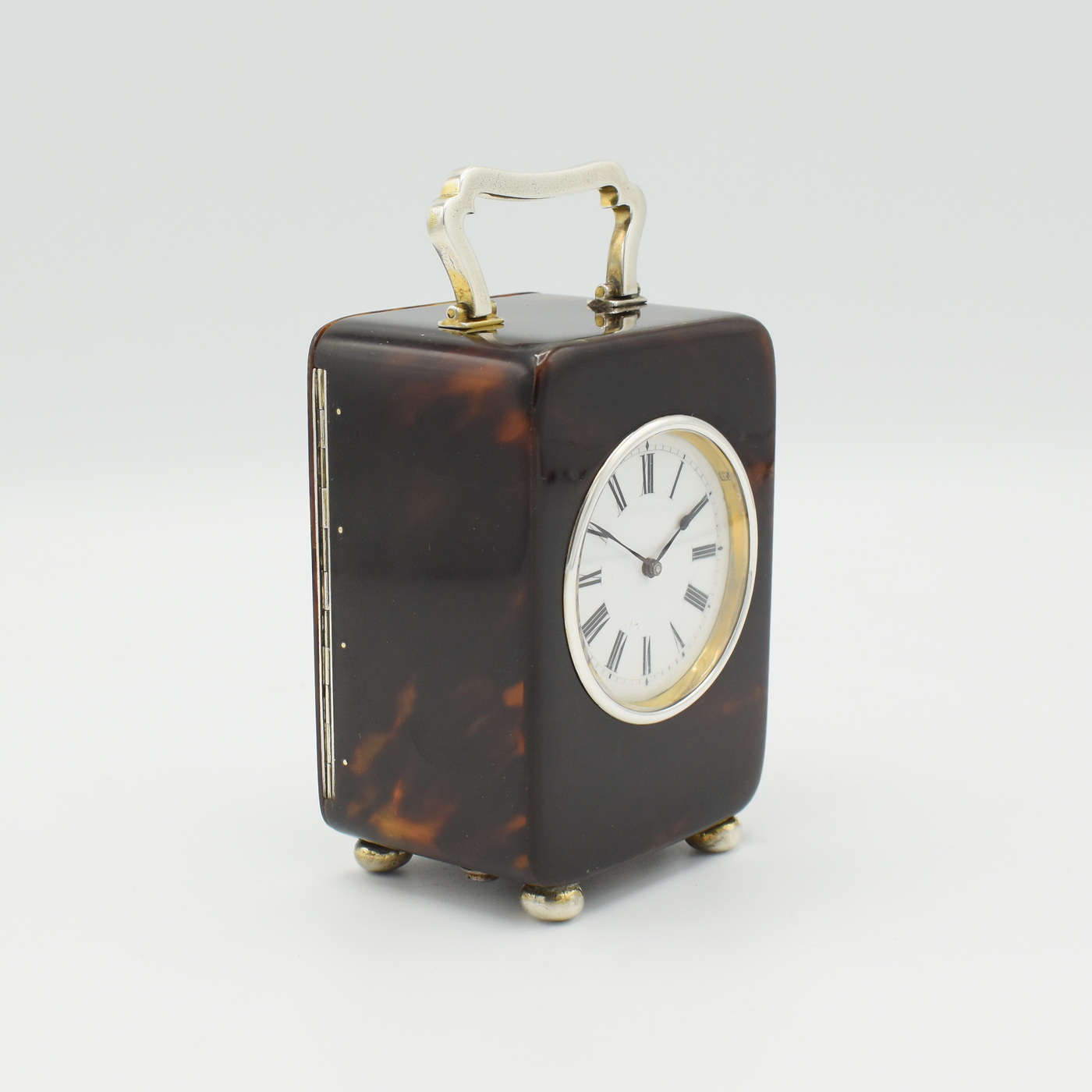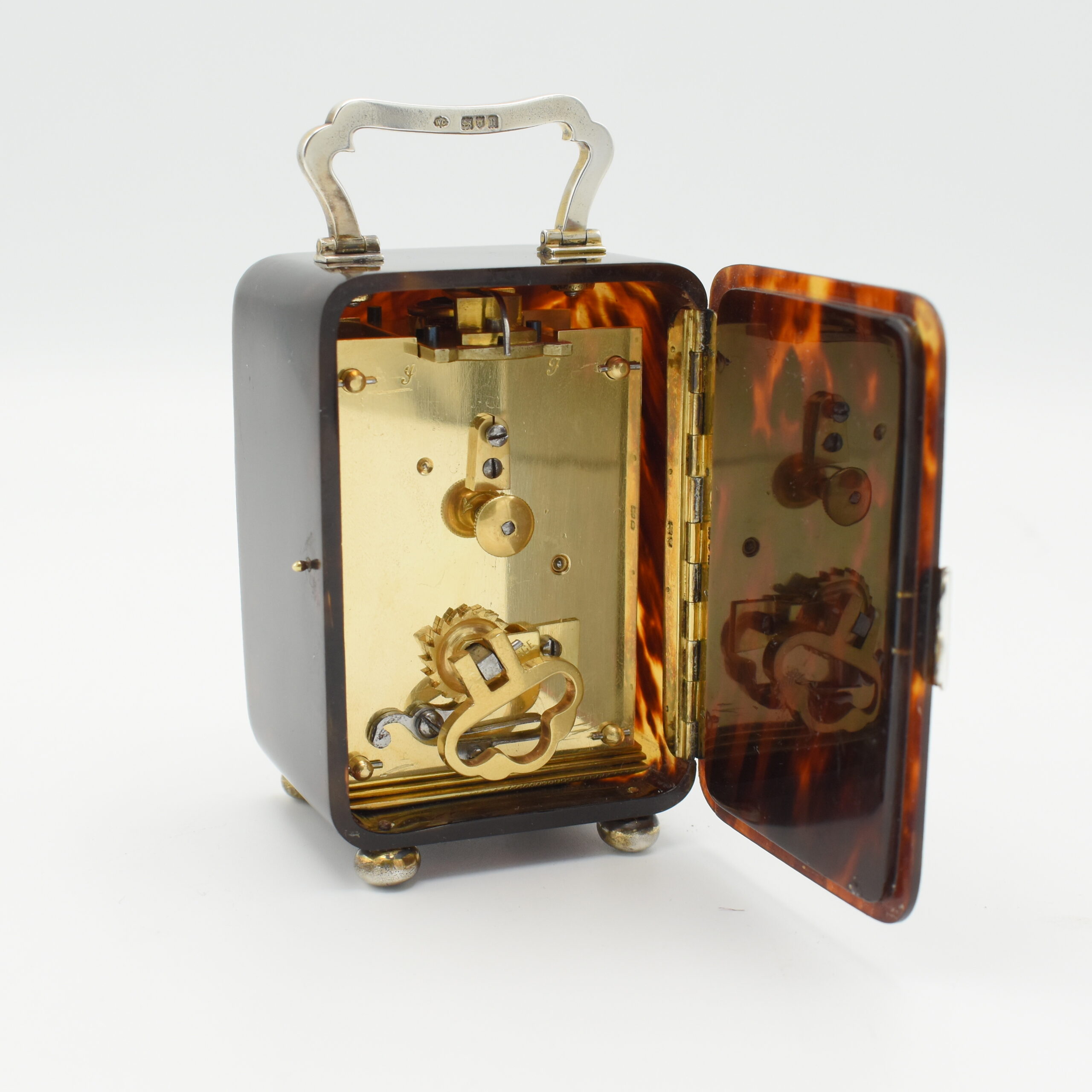 A good size miniature carriage clock with beautiful ‘mock’ tortoise shell case. The classic Art Nouveau inspired carry handle, hinge, bun feet and bezel are all solid silver. The hallmarks on the handle and hinge tell us that it was made by William Comyns Silversmiths of London, in 1908. The case is in good condition with a slight crack to the rear door (which has been professionally repaired) The enamel dial is in excellent condition with only a hairline at the 4 o’clock position, delicate hands and Roman numerals. The movement has been fully overhauled and runs for a week once fully wound.