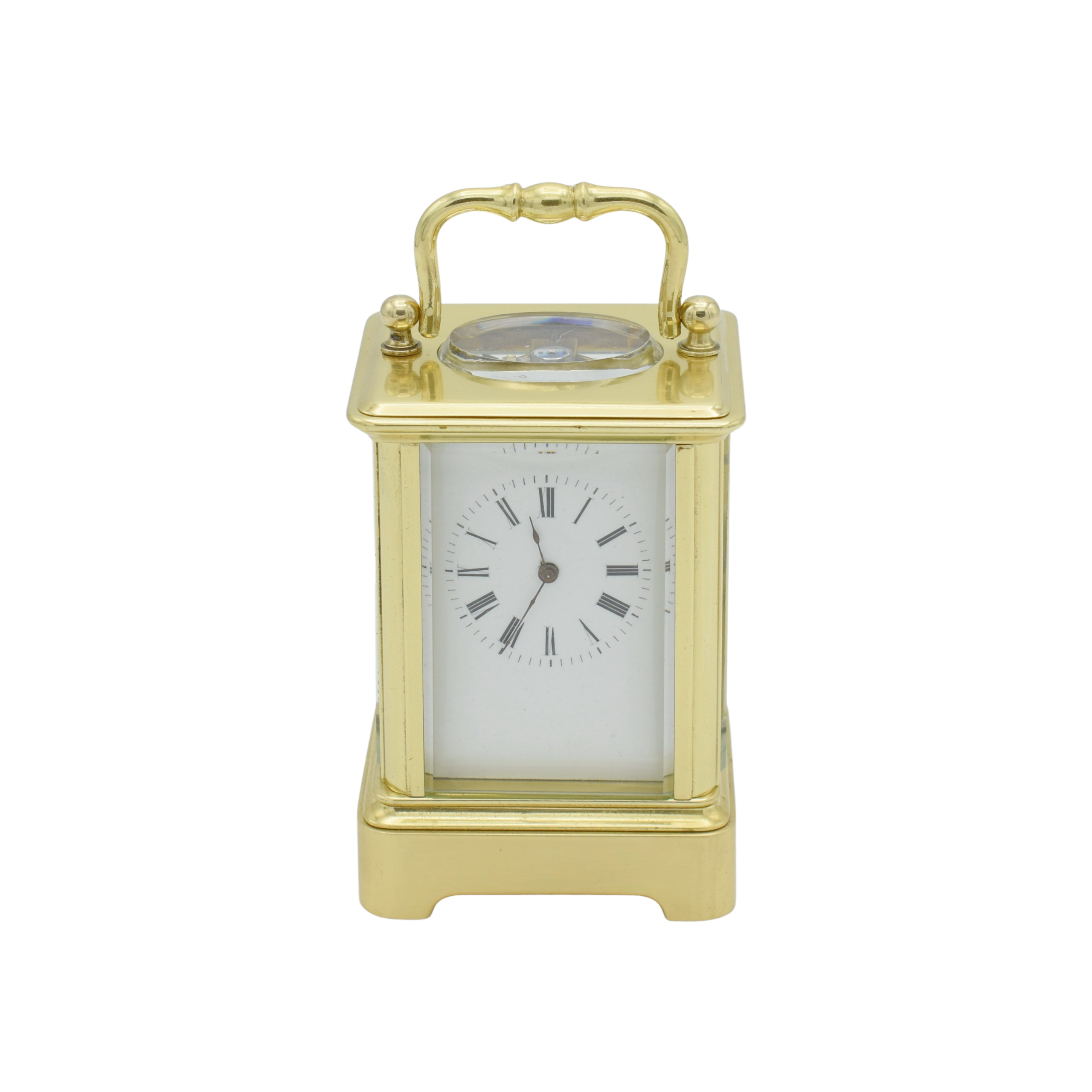 You don’t often see these little miniature carriage timepieces with their original case and original key. This one has both and a fine example it is. The case has much more detail than the average and the leather covered outer case has the little latches to secure the protective lid. The clock has been thoroughly serviced and overhauled and we also striped the case down, polished and professionally lacquered. The dial is immaculate, and the hands are original too. A very small and great example for the collector or perhaps a special occasion or birthday! Only 8cms tall.