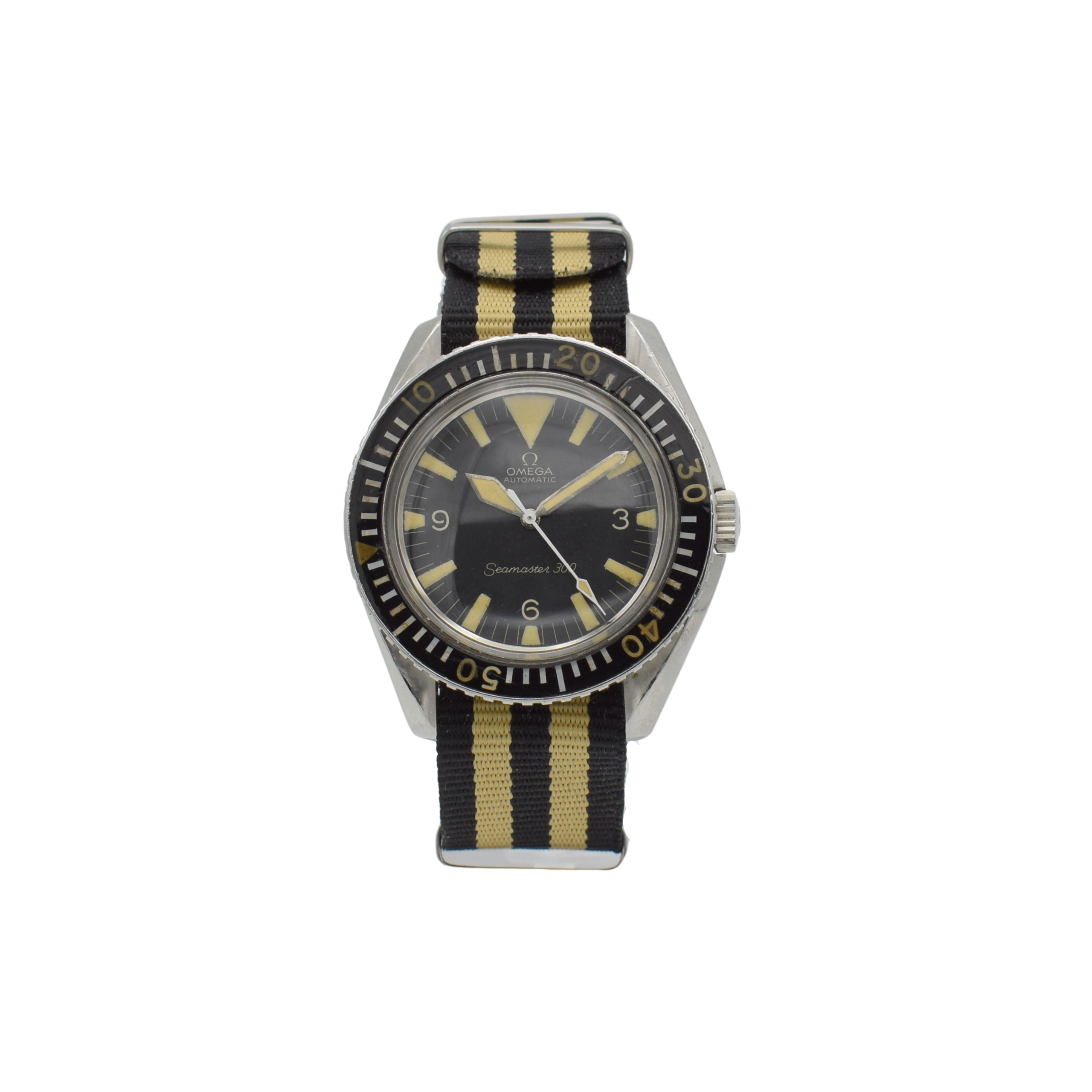 A very good example of the classic dive watch. The Seamaster 300 by Omega became a true ‘tool’ watch of the Special forces, the Royal Navy, Deep sea workers and civilians alike. The large triangle at 12 on these 66 models are quite rare and in our opinion the non date, large triangle, gilt is the best combination. The original bakelite bezel is not perfect but as you would expect on these 50+year watches. The case is also unpolished with ‘dings’ here and there but 100% original, even the crystal is the original with small logo to the center. The dial had very poorly applied Radium lume which was common with these and we had a lume expert apply in the correct way ‘puffy’ and use ‘fast fade’ to help with the original look. The watch also comes with the Extract from the Archives of Omega showing it was sold in the UK on October 3, 1966, these are important to have with the 60’s Seamasters and cost around £100! It will be supplied with a NATO strap in Cream and black stripe which we feel works well with it and also a grey military style NATO as well as the original S/Steel Omega strap. If you are looking for a daily wearer, a watch that already has patina and character and not a watch to hide away in a safe, this might just be the perfect watch!