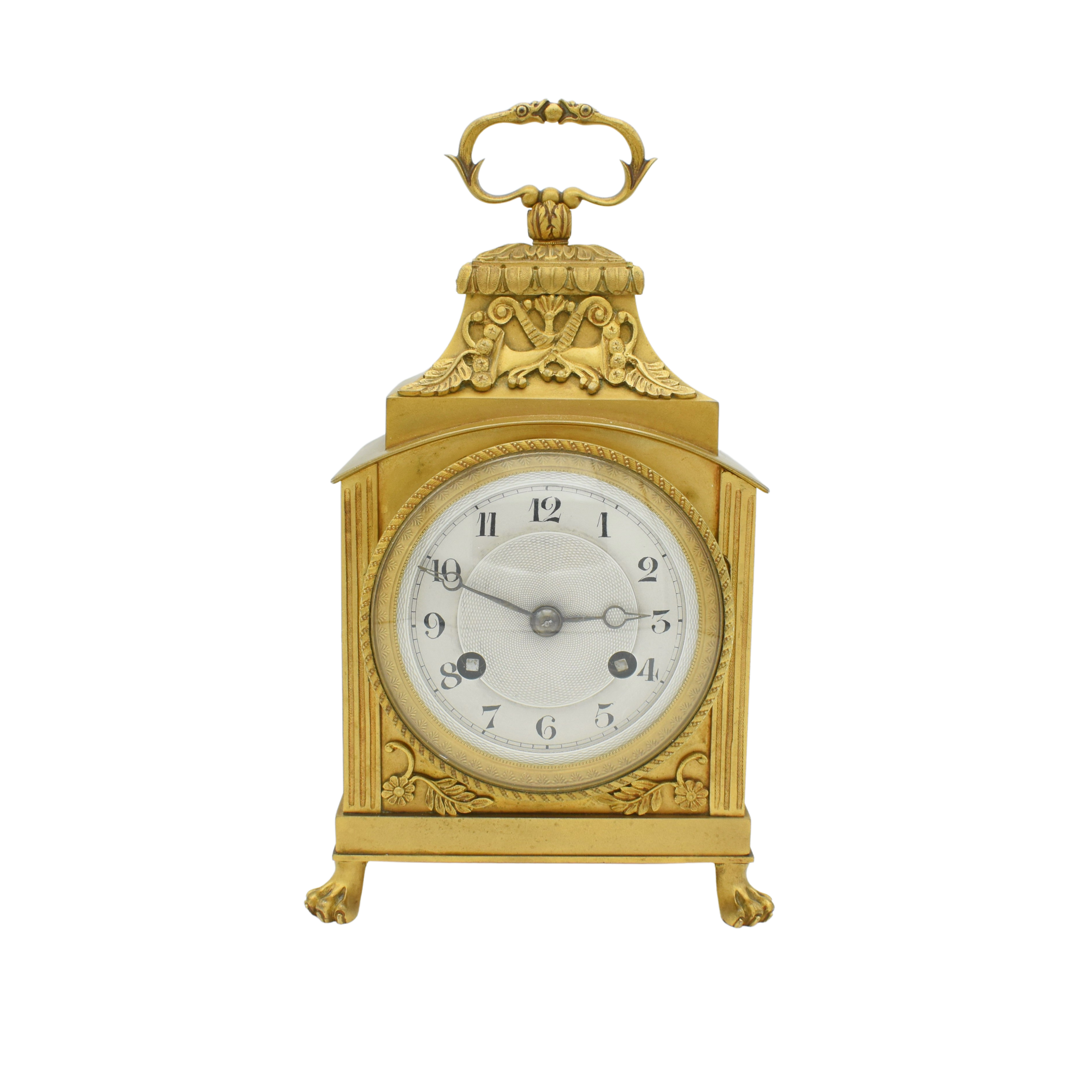 A fine gilt Pendule d’Officier Clock with a superb 8 day duration movement on a jeweled lever and silvered escapement. The beautifully ‘engine turned’ dial showing black Arabic numerals with minutes to the outer edge. Early style true Breguet hands with the cut out on the tip. Strike on the hour and once for the half hours and interestingly on two gongs creating a good mellow tone. The case having floral and ribbon gilt mounts and musical instruments and in the classic ‘Pagoda’ shape. Surmounted by a classical drop handle to carry. Standing on four fine ‘Lions paw’ feet. Circa 1890. If you can visit to see this clock we think you’ll agree, it’s quite impressive. This is the only one have seen with musical instruments cast into the design, which leads us to believe this may have been made by specialcomission for someone with a musical connection 130 years ago.