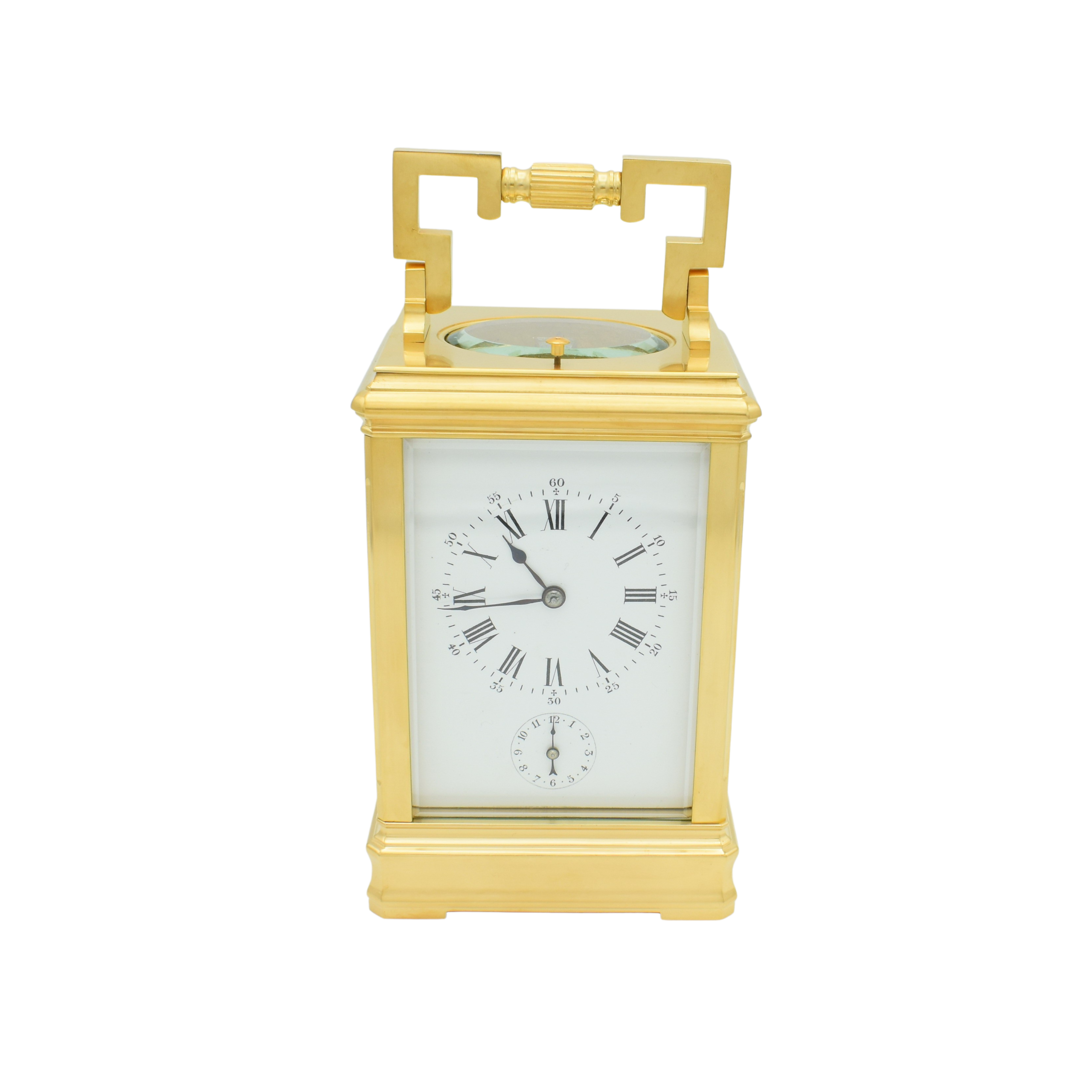 A fine example of a ‘Satin’ gilt cased carriage clock of good size and proportions with original outer protective leather covered case numbered to match clock. This clock benefits from a large clear white dial showing Roman numerals and Arabics for the Alarm dial. A good size oval top glass to view the original silvered platform and lever escapement. The clock has a pleasant gong strike on the hours and half hours and will run for a week per wind. Also with push repeating on demand and of course alarm function. We think this is made by Richard & Co who opened in London in 1857 at 24 Cannon Street. In the bottom left corner it’s numbered 11233 which is also stamped in gilt to the bottom of the Outer case. Dating to around 1890-1900. This is just one of the clocks from our collection for sale. Sold with a full 24 month guarantee.