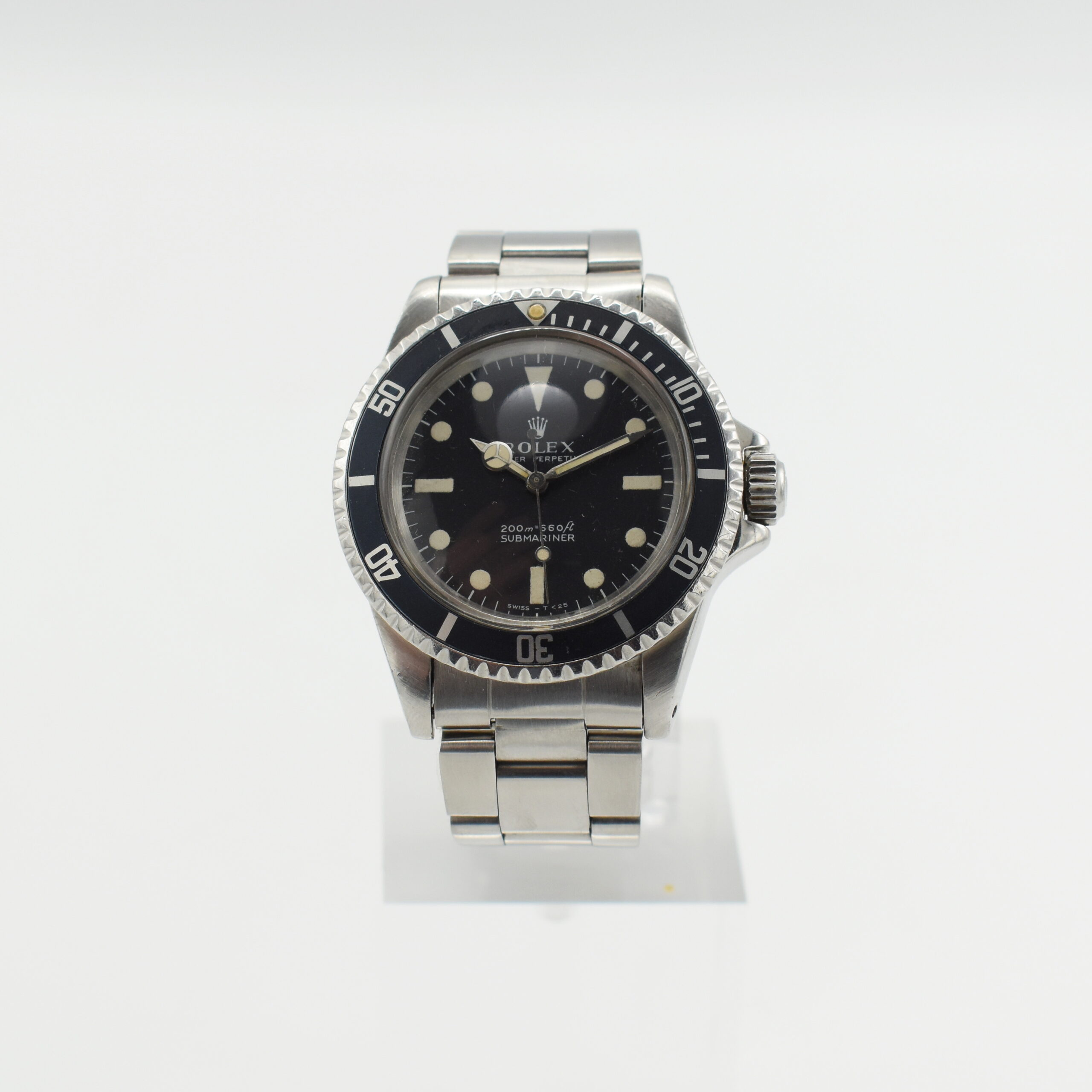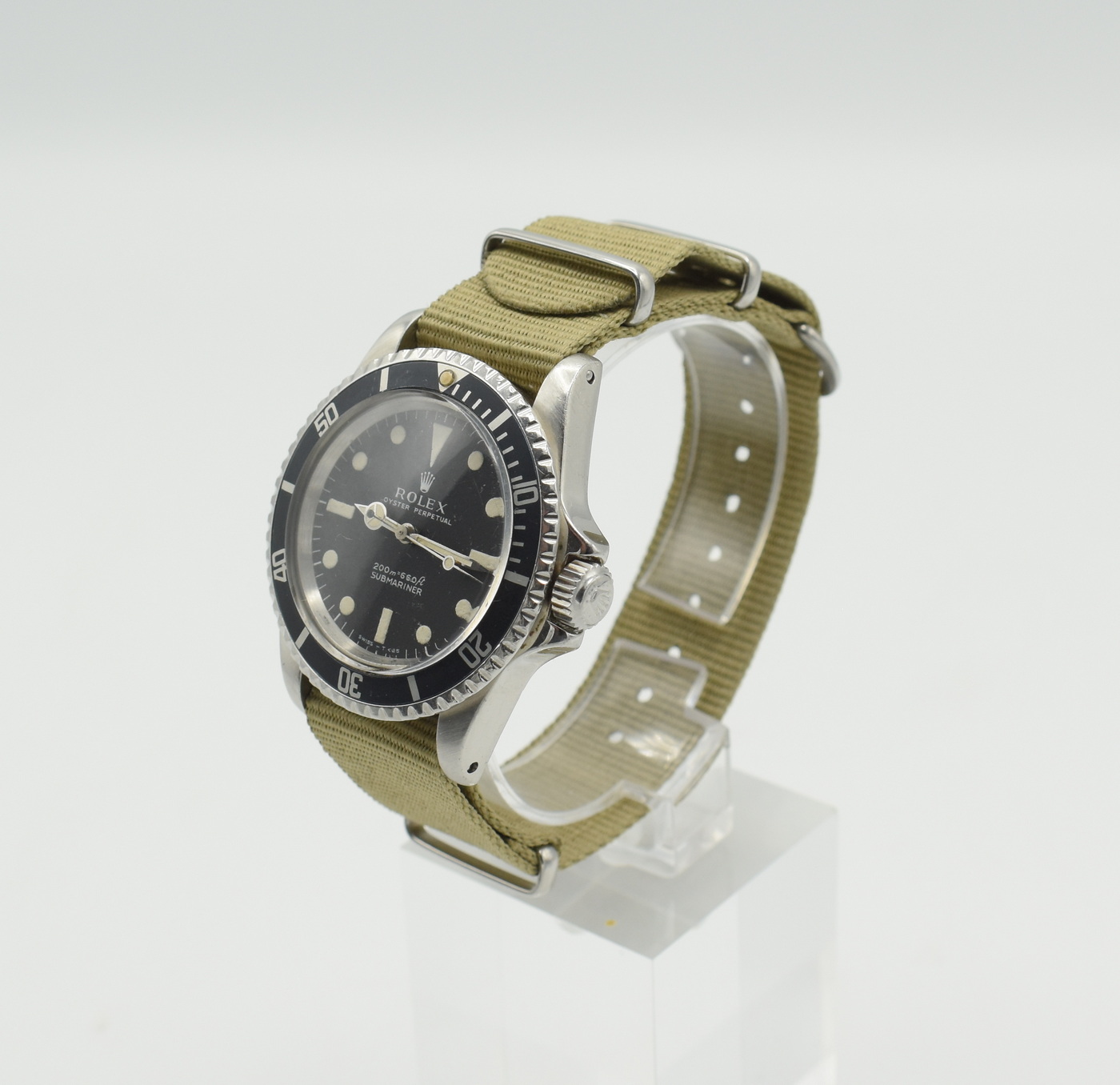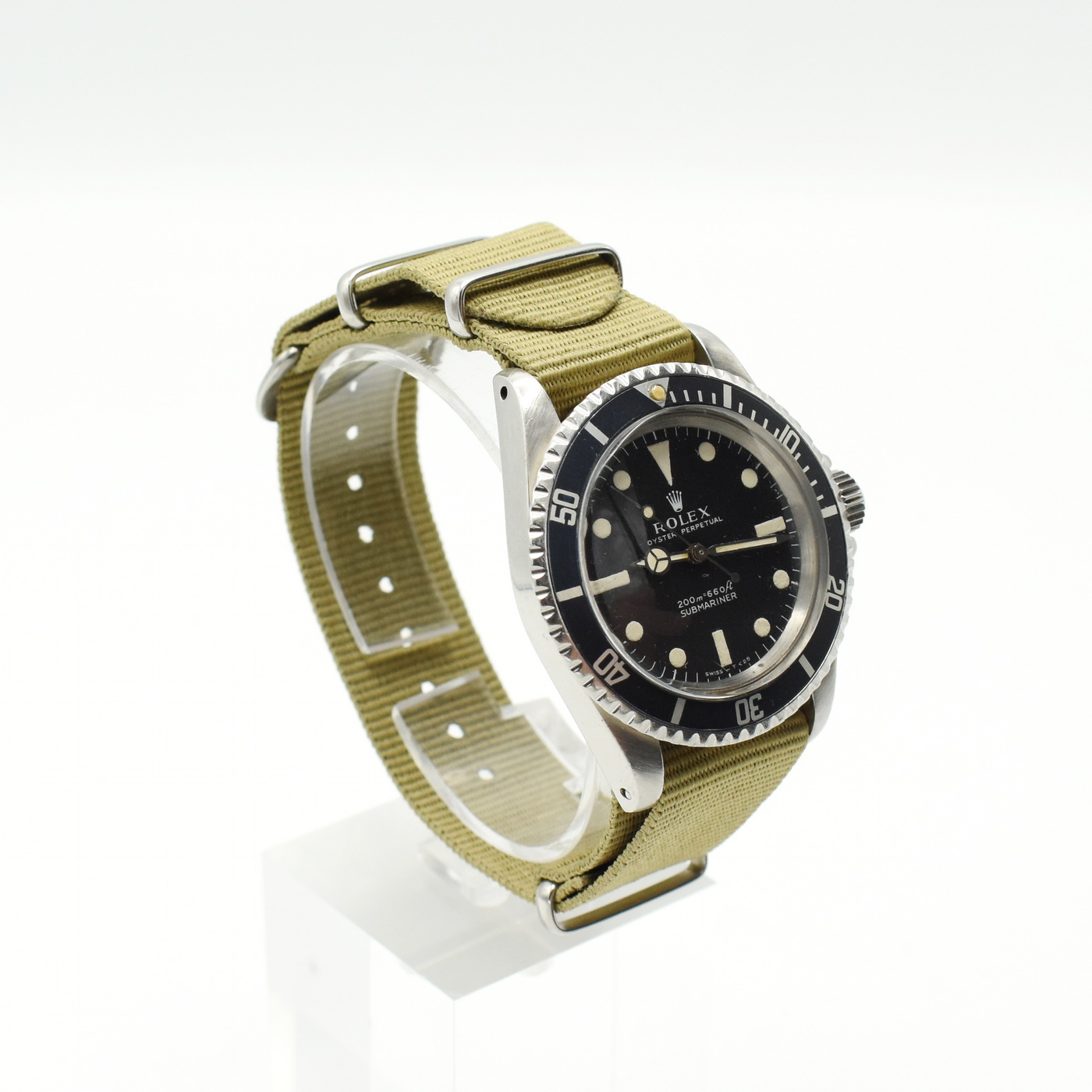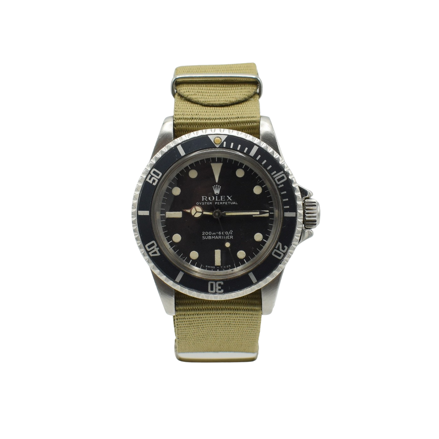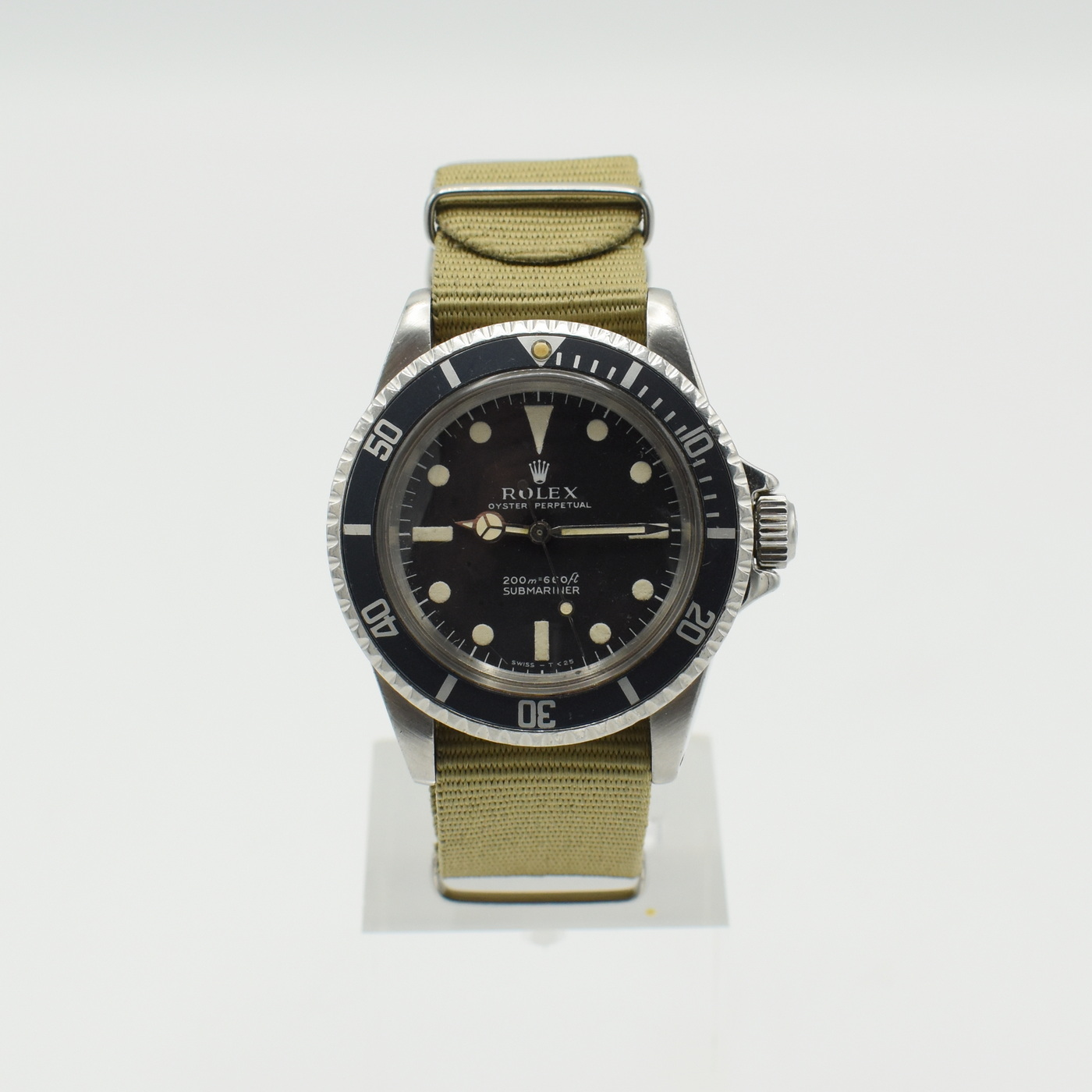 An exceptionally original Rolex Submariner, ref-5513, with the rare ‘Meters First’ dial. Shown on an Olive Nato and on the Rolex Oyster strap which is around 10 years later than the watch ‘head’ (1979) in stainless steel with the original hands and the ‘Lume’ plots are the original Tritium in near perfect condition. The watch has just had a full strip down, overhaul service and strap refurbish. The watch comes with a Rolex box and outer card box. The screw down crown with logo is also the original. Serial number starting 21—- It’s worth noting that these are exceptionally difficult to find in this condition.