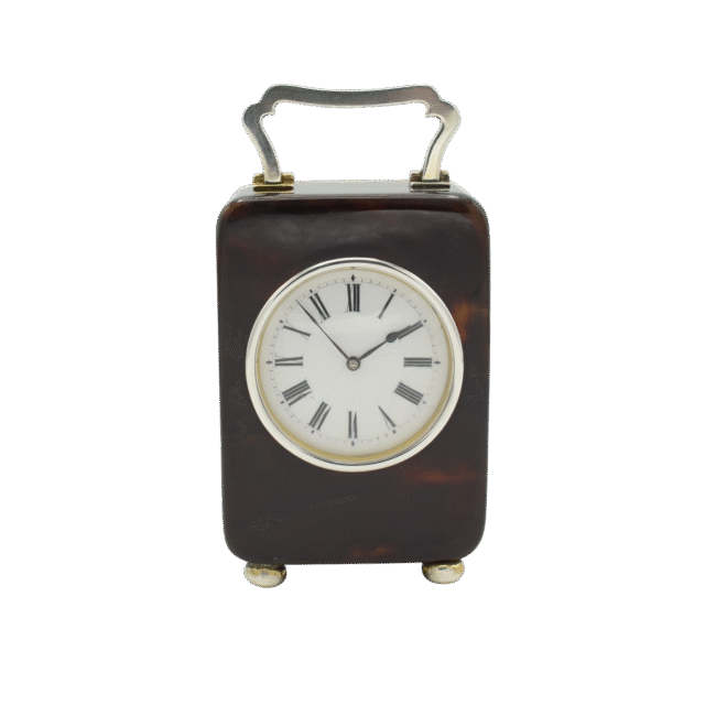 A very nice miniature carriage clock with beautiful 'mock' tortoise shell case. The Deco inspired…