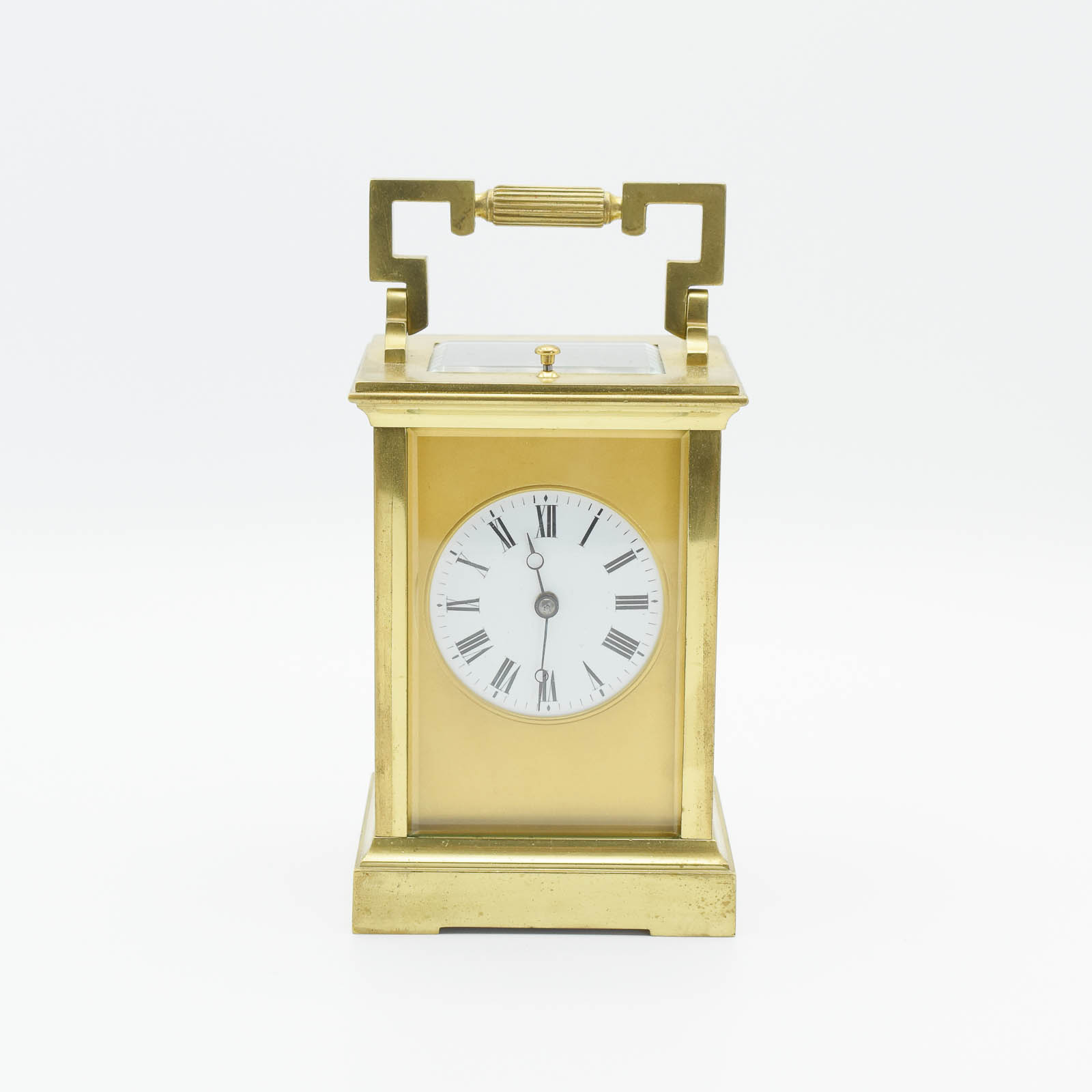 A superb, small masked dial, striking carriage clock. The fully overhauled movement is gong striking on the hour and once for the half hours. The case is polished and laquered so will not require polishing for 15 years or more! This style of carriage clock dates back to aRound 1910. The case style is ‘Anglaise Riche’ and is supplied with original case covered with distressed morrocan leather. This clock also has ‘Push repeat’ on demand and retains the original jewelled lever, Silvered platform escapement.
