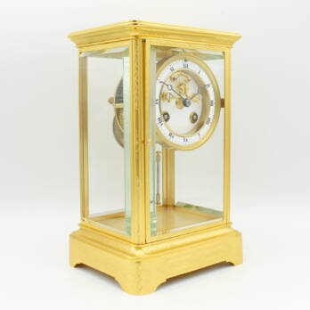 A superb French ‘regulator’ mantel clock of the late 19th century. On display within the four very thick bevelled ‘white’ glass panels is a two piece enamel dial in superb condition, with small Roman numerals on the outer dial, as well as the central visible Brocot escapement, numbered ‘7398’, to the reverse of the dial. The recently overhauled 8-day French movement, striking the hour and half hour on a bell, and the sealed mercury compensating pendulum suspended below. Sitting on a plinth base with bracket feet, the attractive floral engraved case has been re-gilded. Sold with a 24 month guarantee.