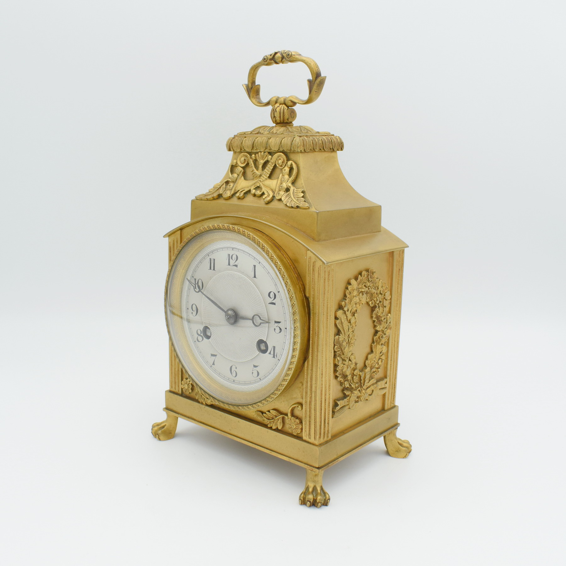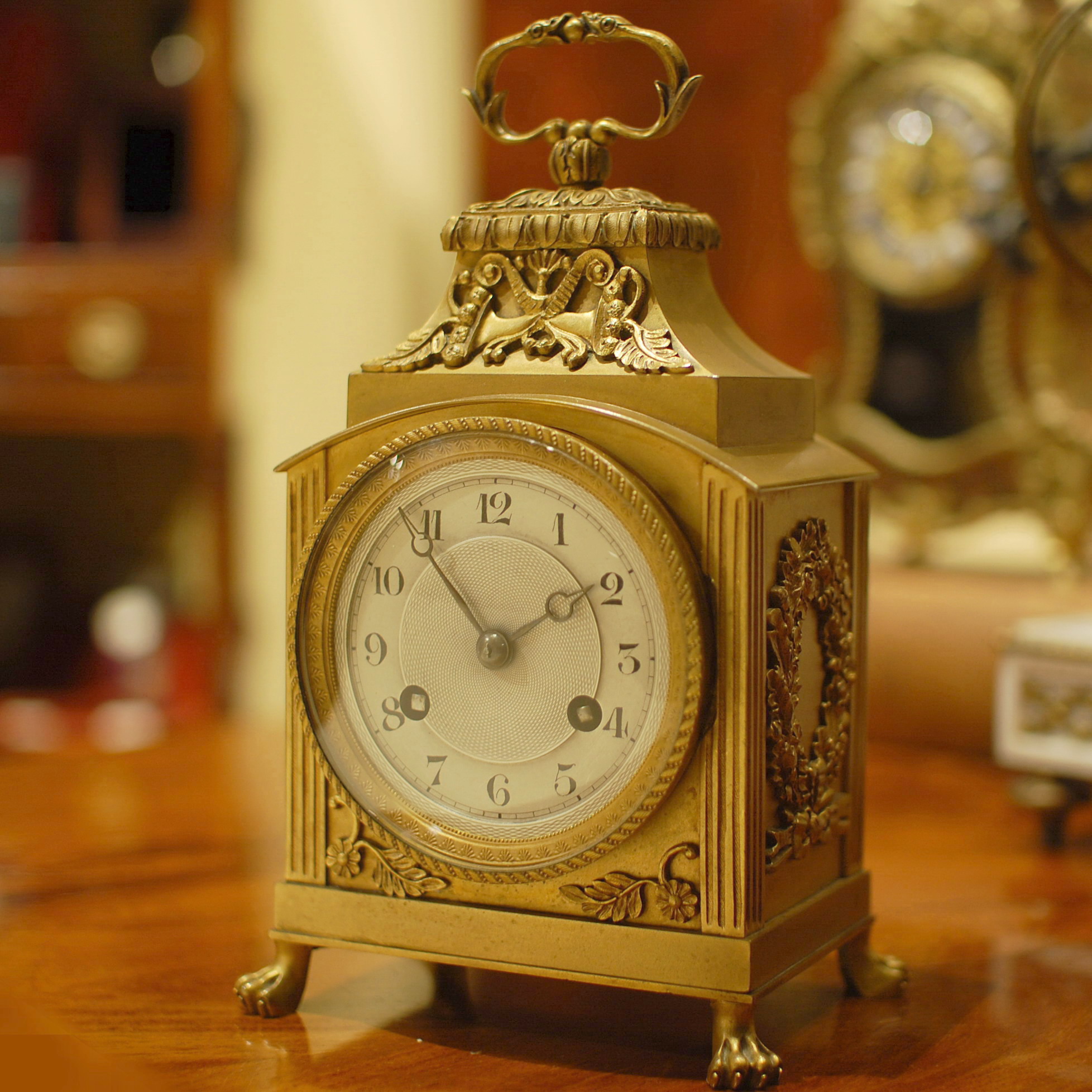 A fine gilt Pendule d’Officier Clock with a superb 8 day duration movement on a jeweled lever and silvered escapement. The beautifully ‘engine turned’ dial showing black Arabic numerals with minutes to the outer edge. Early style true Breguet hands with the cut out on the tip. Strike on the hour and once for the half hours and interestingly on two gongs creating a good mellow tone. The case having floral and ribbon gilt mounts and musical instruments and in the classic ‘Pagoda’ shape. Surmounted by a classical drop handle to carry. Standing on four fine ‘Lions paw’ feet. Circa 1890. If you can visit to see this clock we think you’ll agree, it’s quite impressive. This is the only one have seen with musical instruments cast into the design, which leads us to believe this may have been made by specialcomission for someone with a musical connection 130 years ago.