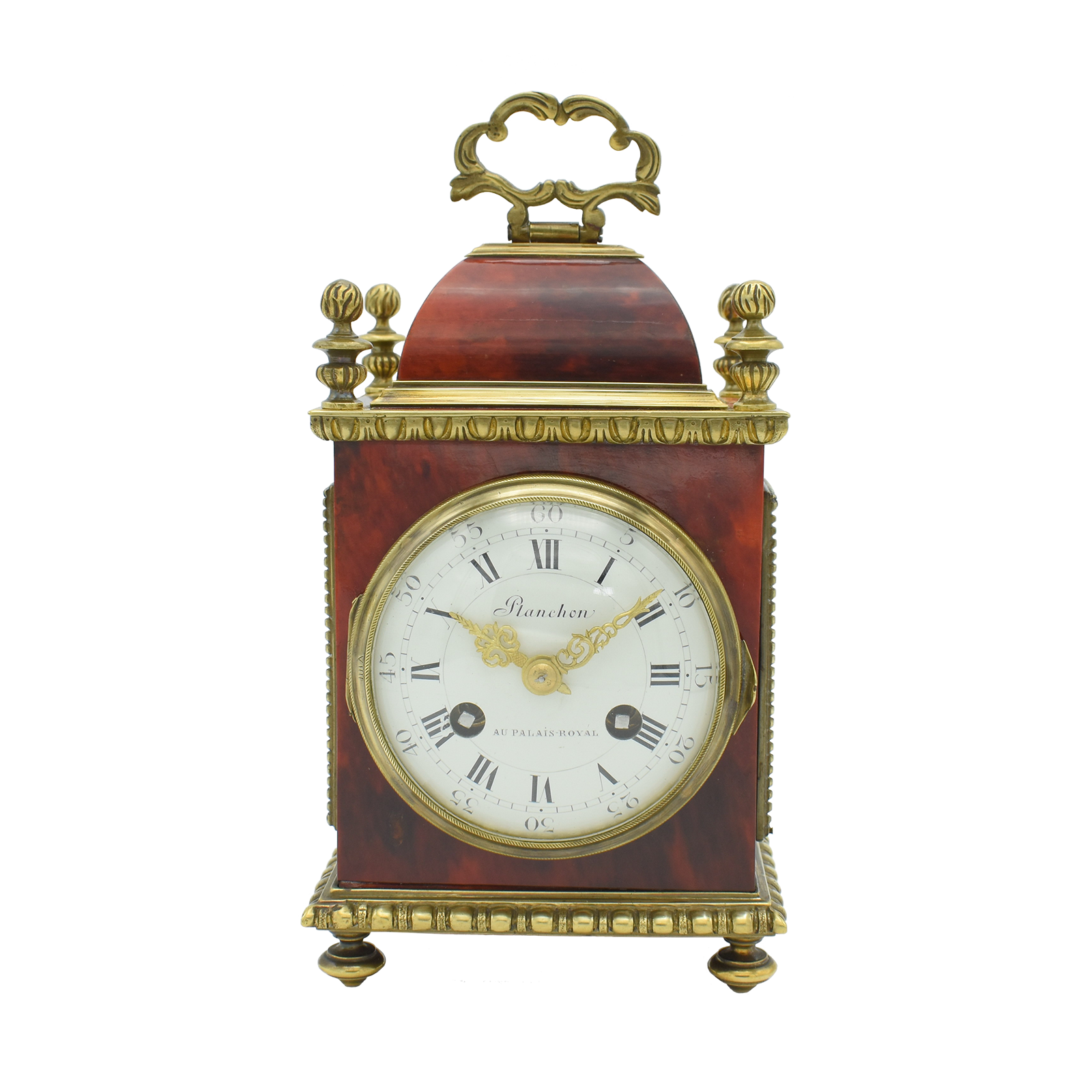 Here we are showing a rather impressive but diminutive clock by the well known Parisian clockmaker Planchon. The clock strikes on a soft coiled gong on the hours and half hours and has an 8 day ‘non pendulum’ movement. The Red shell case is not Tortoiseshell, it is a French laquer/resin that they used in the period and has a deep glossy Ruby lustre. The gilt decorations are very attractive and the handle is actually for carrying the clock from room to room as they may have done in the ‘old’ days! We have had 2 clocks by Planchon during the 41 years of being in business, here (at the same address). Planchon worked and had residence in the Palais Royal, Paris. We would encourage you to visit us to see this very fine little clock in the real world as it really is a little gem! Circa 1890.